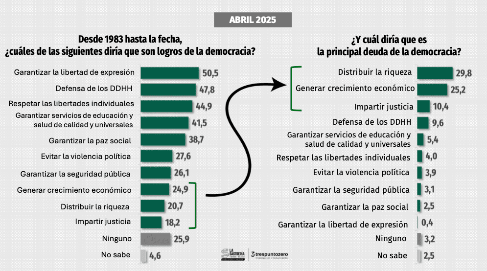 Al analizar los resultados recogidos por Vilker, un informe de La Sastrería, de Raúl Timerman y Juan Carlos Malagoli, destaca: “La promesa de la democracia permanece, a juicio de muchos, incumplida desde 1983. La ciudadanía percibe que el sistema democrático no ha logrado dar respuesta a sus demandas más urgentes, de carácter material y cotidiano (…) Así, el voto pierde eficacia como herramienta de control y compromiso político.”