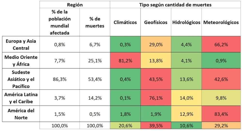 ¿A cuánta gente afecta y qué tan letales son? El cuadro siguiente muestra la distribución geográfica de las personas afectadas y la cantidad de muertes (columnas 1 y 2), y luego cómo éstas se reparten entre los distintos tipos (columnas 3 a 6). Combinando la información del gráfico anterior y del cuadro podemos identificar ciertos rasgos distintivos para cada caso. Los eventos hidrológicos son los más frecuentes, afectando a la mayoría de la población, pero son también los menos letales. En cambio, los geofísicos son los menos frecuentes y los que afectan a una menor cantidad de población, pero son los más letales. Los eventos meteorológicos se encuentran justo en el medio, tanto en términos de frecuencia, como de población afectada y de muertes. Los climatológicos son pocos frecuentes y letales, salvo en la región de Medio Oriente y África, donde afectan a buena parte de la población).