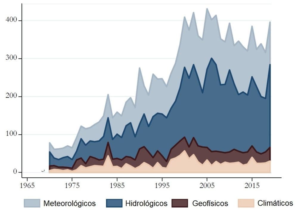 Como se puede ver en el gráfico a continuación, los desastres naturales han aumentado en el tiempo, sobre todo debido al crecimiento de los eventos hidrológicos y los climáticos (que se multiplicaron por 6 desde 1970), los cuales probablemente hayan estado provocados por el cambio climático. No obstante, los fenómenos geofísicos también se incrementaron (por tres), y como no están asociados al cambio climático, esto sugiere que parte del aumento se debe a la mejora en la calidad de los registros estadísticos.