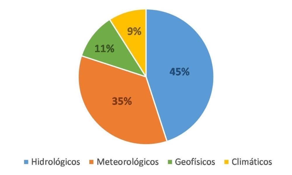 En función de eso, los autores identifican 12.377 desastres registrados entre 1970 y 2019, clasificados según estos 4 tipos. Alrededor del 45% son hidrológicos, 35% son meteorológicos y 11% son geofísicos. Estos eventos provocan grandes daños en muy poco tiempo (en promedio duran unos 10 días) y son difíciles de predecir, tanto para el momento como la ubicación, con lo cual pueden ser considerados como típicos shocks negativos a la economía. En cambio, las sequías (que representan 5,3% del total) duran mucho más, unos 232 días en promedio.