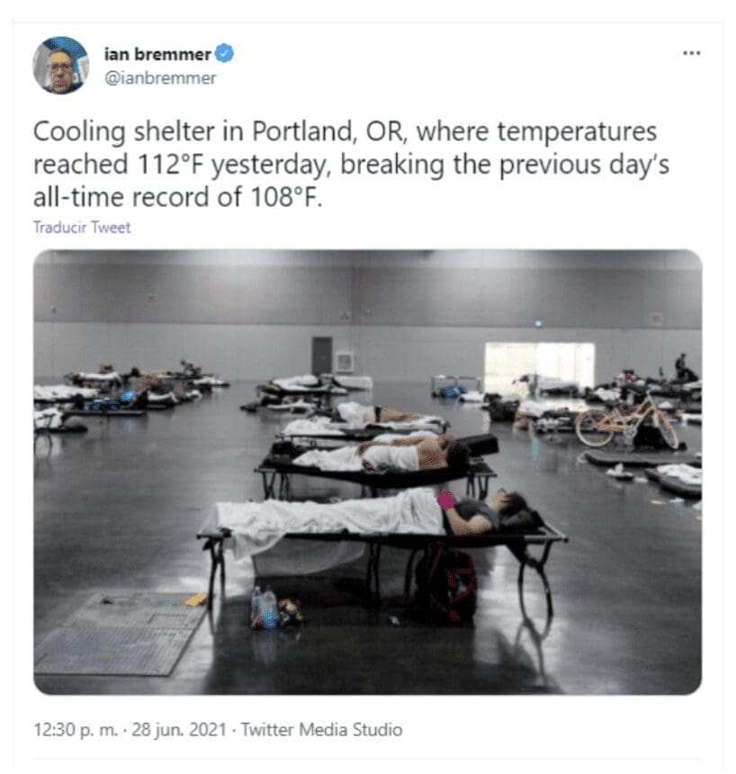 Estados Unidos. También atraviesa una ola de calor y en el oeste están sufriendo la peor sequía de su historia. No solo en el sur de California, sino también en estados tradicionalmente menos expuestos a la escasez de agua que se enfrentan ahora a una situación inédita. La escasez de agua tiene cuatro efectos principales: i) menor disponibilidad para el consumo doméstico, ii) riesgo en el suministro eléctrico proveniente de hidroeléctricas, iii) impacto sobre la agricultura y iv) mayor riesgo de incendios. En Alaska, los glaciares que se rompen de manera acelerada por esta misma ola están produciendo «terremotos de hielo» tan poderosos como un pequeño terremoto mientras se desmoronan en el mar. En Portland hacían 44°C y tuvieron que instalar refugios de enfriamiento.