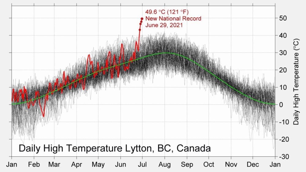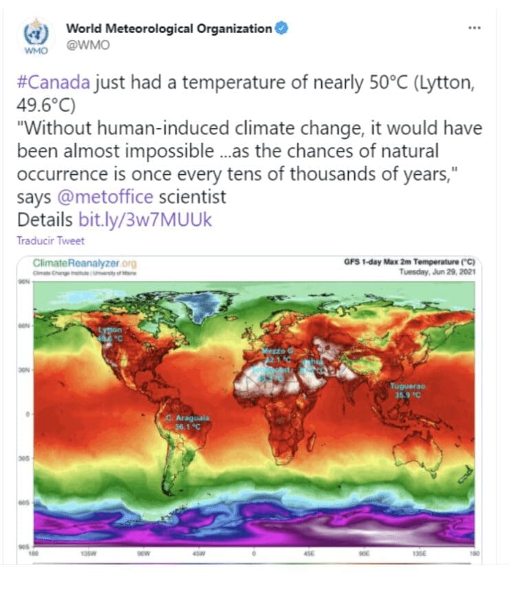 Canadá. Está experimentando una ola de calor inédita, llegando casi a los 50°C en algunos lugares. Los científicos de la Organización Metereológica Mundial dicen que “sin el cambio climático esto habría sido casi imposible, ya que las posibilidades de que ocurra de forma natural son una vez cada decenas de miles de años”.