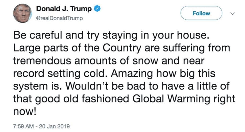A partir de esto, entonces, tenemos dos conclusiones. 1) La variación normal del clima se mantiene, no es que por el cambio climático ahora nunca más va a hacer frío. Recordemos esta joyita de Donald que, frente a una ola de frío, pedía que vuelva el cambio climático: