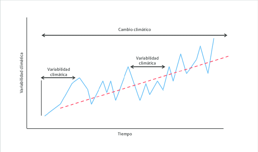 Por ejemplo, si miramos una serie temporal de la temperatura de la Ciudad de Buenos Aires de los últimos 100 años, vemos que hubo años más calientes y otros más fríos, eso es la variabilidad normal. Lo que hace el cambio climático es generar una tendencia gradual de aumento de la temperatura sobre la cual se continúa expresando la variación normal del clima. Más o menos así: