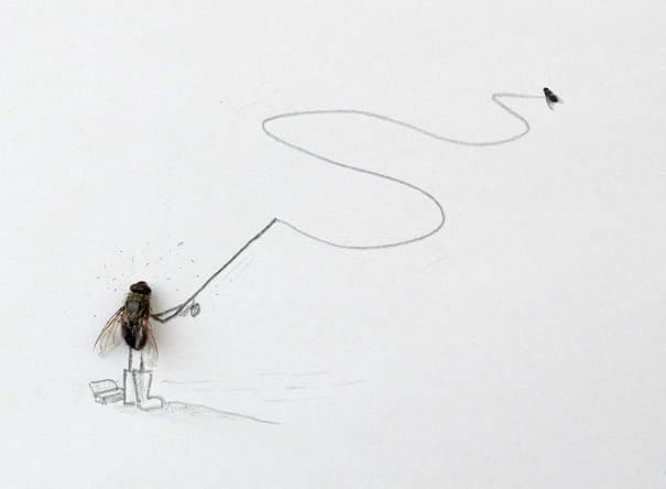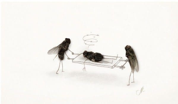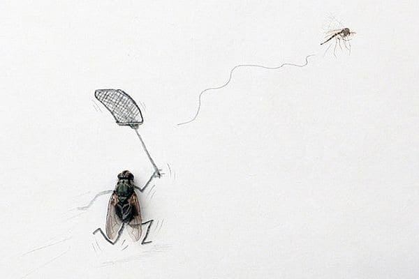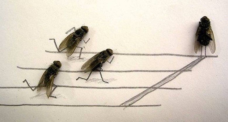 A raíz de esta presencia constante de insectos estos últimos días, con las incomodidades del caso, es que me puse a rastrear obras que les dedican espacio. Pero también me puse a pensar en su deshumanización total, como si ante ellos no estuviésemos frente a seres vivos. Sí, ya sé que son indeseables y que pueden incluso contagiar dengue o chikungunya, ¿pero no les parece extraño que naturalicemos el exterminio de cientos de miles de mosquitos a diario? Mientras a muchas otras especies queremos salvarlas de la cruel humanidad, a los mosquitos queremos verlos muertos lo antes posible. Así que ajusticiando todas las muertes de zancudos, vamos a ocuparnos acá de esos seres sin conciencia que vampirizan nuestra sangre y nos dejan su marca en la piel, y también, ya que estamos, de las curiosas moscas, tan ruidosas, inoportunas y asociadas a lo sucio y desagradable. Llamativamente, hay muchas obras sobre ellos, más de las que imaginaba y de las que entran acá. Empecemos a revisarlas mechadas con las fotografías intervenidas del artista sueco Magnus Muhr, que justamente juega a poner a moscas muertas en situaciones humanas, a ver qué sensaciones encontradas nos causan.