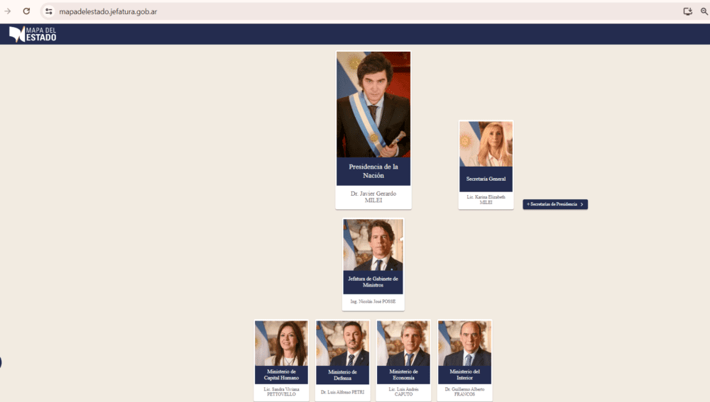 Karina actúa en sentido inverso a Caputo y alardea su poder incluso en cuestiones pueriles, como el Mapa del Estado, donde la hermanísima aparece al lado del presidente y por encima de Posse y del resto de los ministros. No falsea la realidad, pero lo explícito puede traducirse como una falencia. “¿Sabés que le pasa a Karina? Cree que puede intervenir en todo y no sabe de nada”, la fusila un dirigente y remite, siempre, a los Menem, Martín y “Lule”, los escuderos que parecen usar en beneficio propio su ascendencia, constelación mediante, sobre la hermana presidencial.