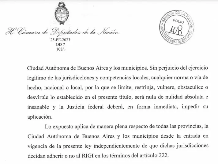 El mencionado artículo declara la nulidad de toda norma “nacional o local” que “limita, restrinja, vulnere, obstaculice o desvirtúe” lo que impone el articulado de la Ley Bases sobre el RIGI. Y aporta una osadía más: obliga a la Justicia federal a impedir la aplicación de cualquier norma contraria al RIGI. Una micro constitución en dos párrafos que barre el federalismo y la división de poderes.