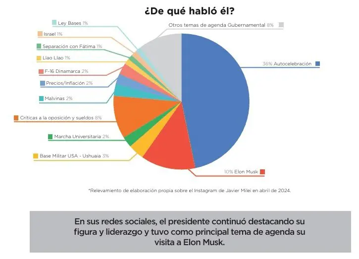 Un informe de Ad Hoc registró que el 36% de las intervenciones de Milei en su Instagram, durante abril, fueron posteos de autocelebración, más del 10% sobre Elon Musk y un 8% que dedicó a cuestionar a la oposición. Milei solo dedicó un 2% de sus intervenciones al tema universitario, mientras que el casi el 32% de la conversación en redes fue sobre la educación pública.