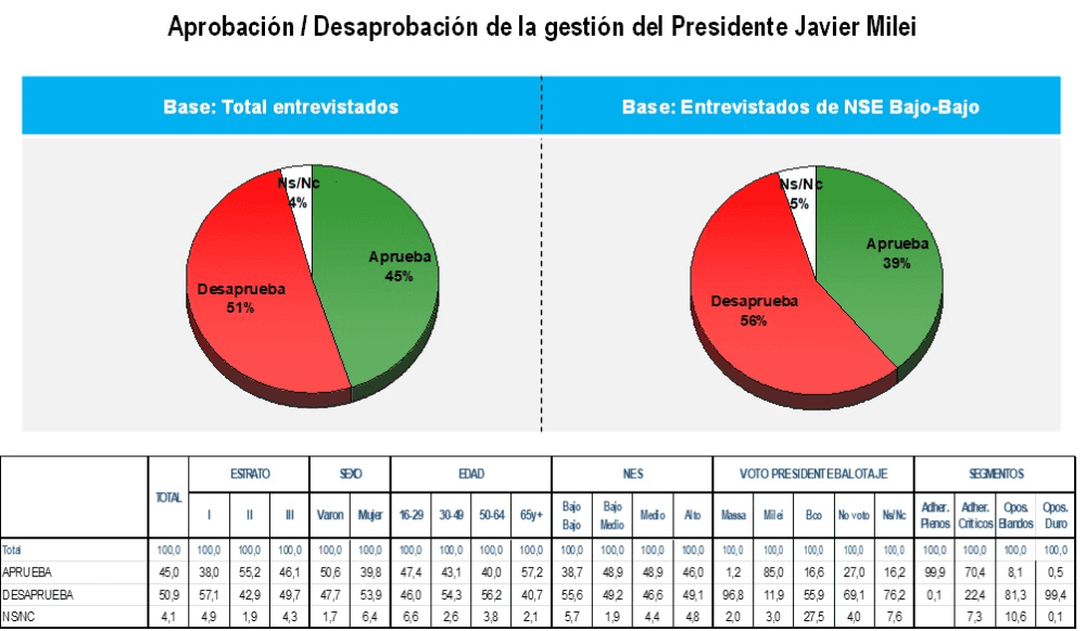 ¿Empieza Milei a pagar el costo de esos errores? Hay una frontera temporal, difícil de establecer, cuando un Gobierno es señalado como responsable del presente. El malestar actual es, todavía, atribuido a la gestión de los Fernández. Pero el clima social atraviesa otro debate. Hay dos bibliotecas entre los consultores respecto de la imagen del presidente: un pelotón de encuestas ubica la positiva por encima del 50% y otro registra que la desaprobación superó a la aprobación. Hay hasta 14 puntos de diferencia entre los 43% de positiva que marca Zuban-Córdoba y los 57% de Poliarquía. ¿La metodología explica esa distancia?