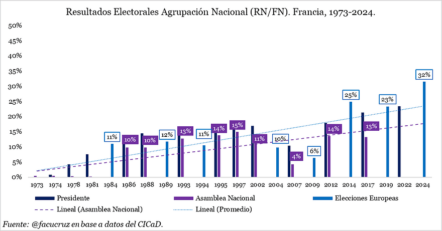 Esa es la buena noticia para la política francesa. La mala viene con el segundo dato que te voy a comentar. Las primeras encuestas que circularon en esta vorágine muestran una tendencia ascendente para el espacio liderado por Le Pen (en mayor medida) y para el Nuevo Frente Popular de toda la izquierda (en menor medida). La oposición de ambos polos, al alza. El oficialismo, a la baja. Hoy las elecciones las estaría ganando RN con poco más del 30%, algo bastante parecido a lo que sacó en las europeas. Segundo quedaría la coalición de Mélenchon con un 28% y recién tercero llegaría Macron con poco menos del 20%.