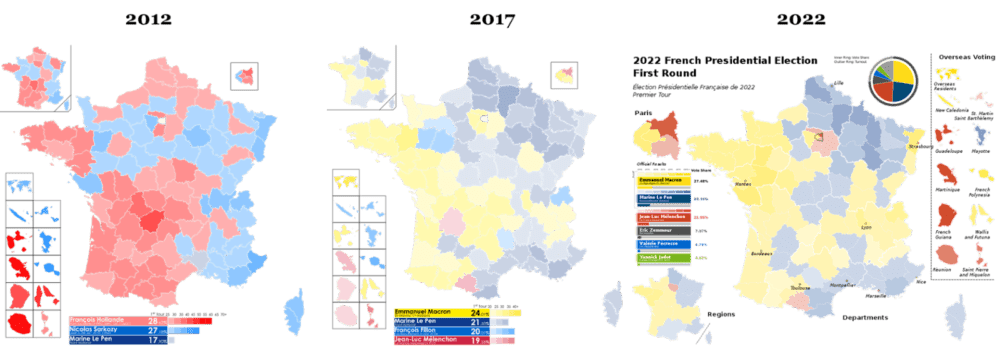 Los mapas a continuación te muestran dos cosas. La primera es que, si comparamos las primeras vueltas de las últimas dos elecciones presidenciales (2017 y 2022) versus la última en la que compitieron con chances socialistas y gaullistas (2012), se ve cómo Macron entró en territorio rojo y Le Pen en territorio azul. Ahora Francia es mitad amarilla y mitad azul oscuro.