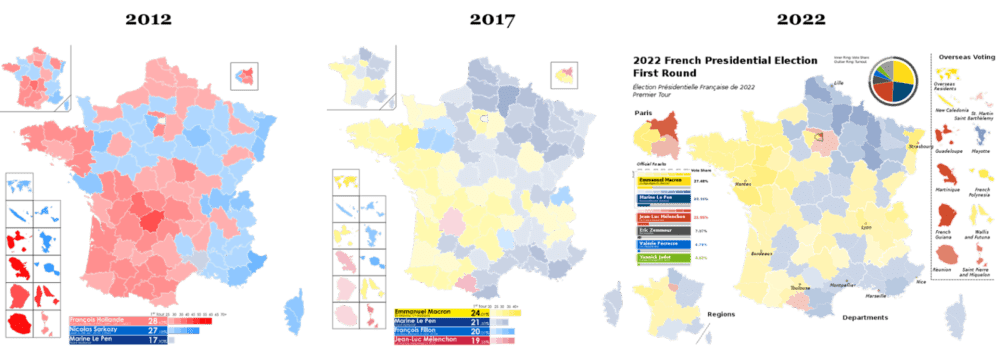 Los mapas a continuación te muestran dos cosas. La primera es que, si comparamos las primeras vueltas de las últimas dos elecciones presidenciales (2017 y 2022) versus la última en la que compitieron con chances socialistas y gaullistas (2012), se ve cómo Macron entró en territorio rojo y Le Pen en territorio azul. Ahora Francia es mitad amarilla y mitad azul oscuro.