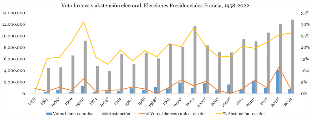En el próximo gráfico podés ver la evolución de la abstención electoral y del voto blanco + voto nulo desde 1958 hasta hace un par de domingos. Me interesa que veas los saltos que hay entre la primera vuelta y el ballotage posterior (años con *). Fijate que no es común que crezca el abstencionismo. Al contrario, casi siempre (salvo en 1965 y en 1969) vota más gente en un ballotage que en la primera vuelta. Esto muestra que los franceses salen de sus casas cuando se define el inquilino del Palacio del Eliseo. El dato relevante es que el salto entre vueltas electorales es del voto bronca. Esto es particularmente simbólico en la última elección presidencial, la de hace 5 años. Cuando chocaron Macron y Le Pen en su primera batalla, la sumatoria de blancos con nulos se multiplicó por 4,5, la subida más grande en la historia de la Quinta República. En este contexto se vuelven simbólicas protestas como esta.