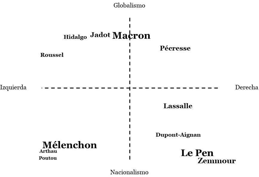 La segunda cosa nos lleva a pensar que la dinámica política francesa actual ya no es solamente la dimensión izquierda versus derecha a la vieja usanza, sino que se cruza una segunda: nacionalismo vs. globalismo. Si Francia es uno de los epicentros y motores de funcionamiento de la Unión Europea, entonces es esperable que sus partidos políticos asuman posiciones políticas en torno a una mayor o menor integración regional. Esto, que al comienzo era marginal en las peleas electorales, hoy es un eje de discusión político-partidario muy relevante. Hay partidos que han levantado el nacionalismo cerrado como bandera y han crecido bajo su defensa a ultranza. Uno de ellos es, precisamente, Rassemblement National y su referente, Le Pen (acá resaltan el temor que genera esto en Bruselas). Para entender mejor esto, armé un esquema conceptual sencillo en base al posicionamiento que cada partido asume en sus posturas públicas. No tiene mucha matemática, es más bien a ojo. El tamaño de los nombres es un aproximado de la cantidad de votos que cada candidatura presidencial obtuvo hace casi dos semanas.