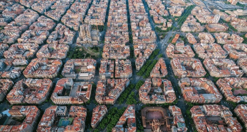 “Ruralizar lo urbano y urbanizar lo rural” era la idea que corría detrás de toda la teoría urbana de Cerdá. Por eso probablemente impuso el plantado masivo de árboles, veredas anchas y una particular forma de manzanas octogonales: 133 metros de lado con esquinas a 45 grados y de 20 metros de longitud cuya vista cenital sea probablemente la postal aérea más conocida de Barcelona. Se trata del barrio de L’Eixample (El ensanche)