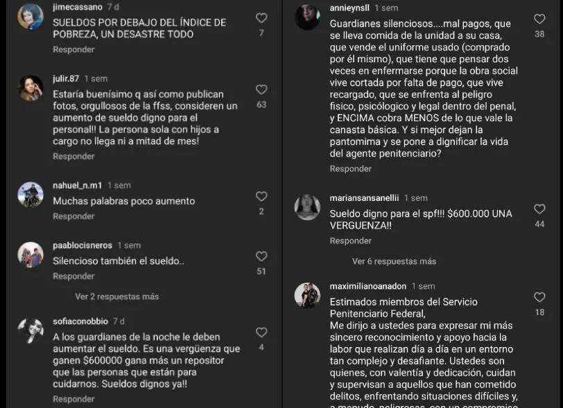 Para desactivar las protestas, el Gobierno dispuso este viernes un aumento del 5% para los efectivos de la Policía Federal, Gendarmería, Prefectura y otras fuerzas de seguridad nacionales. La incógnita es si alcanzará, pues el atraso salarial se suma a la interrupción de una política que había iniciado Sabina Frederic durante su gestión para blanquear progresivamente ítems que los agentes cobran en negro. Para tener una pequeña muestra del malestar alcanza con revisar los comentarios a este posteo del Ministerio de Seguridad en Instagram.