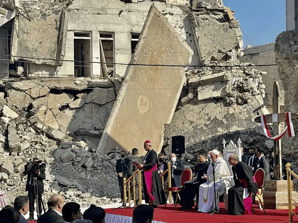 En Mosul el papa Francisco visitó la Plaza de la Iglesia. Rezó por las víctimas del Estado Islámico rodeado de las ruinas de cuatro iglesias. Le habló a las minorías de cristianos iraquíes pero también a la sociedad entera: «Qué cruel es que este país, cuna de la civilización, haya sido afectado por un golpe tan bárbaro, con lugares de culto antiguos destruidos y muchos miles de personas musulmanes, cristianos, yazidíes y otros desplazados por la fuerza o asesinados. Hoy, sin embargo, reafirmamos nuestra convicción de que la fraternidad es más duradera que el fratricidio, que la esperanza es más poderosa que el odio, que la paz es más poderosa que la guerra».