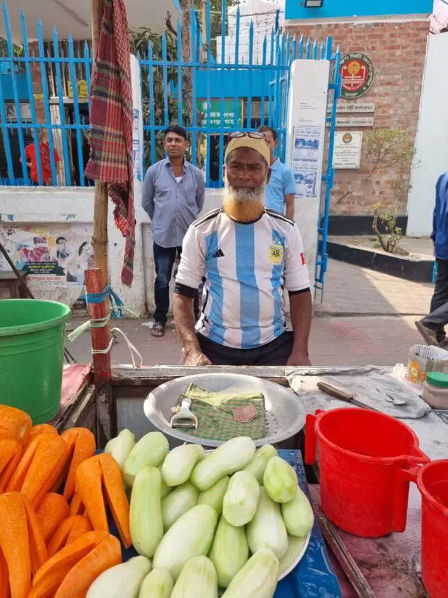 Hablé con muchísima gente. Mohammadiz, vendedor de frutas en la calle, que no domina el inglés pero sí se acuerda de Caniggia, Ortega y Batistuta (el idioma nacional es el bengalí, en el que escribía el gran poeta Rabindranath Tagore, íntimo amigo de nuestra eterna Victoria Ocampo). También charlé con Abdul, que me mostró el video de la torta de su cumpleaños: un gigantesco bizcochuelo en forma de Copa del mundo. Saki, que quiere estudiar español para poder decirle algo a Messi cuando venga. Me pasó algo increíble en un mundo que a veces es un pañuelo: me crucé en la calle a Faysal, Raheen y Alam, ¡que viven en Once, centro porteño, y administran un negocio de electrodomésticos, y estaban visitando a sus familias! “Lo que más extraño es el asadito”, me dijo Alam, que además me contó que sus amigos y amigas argentinas le dicen Alan. Aysha, una estudiante de trenzas bien oscuras, que no usaba velo para cubrirse el cabello pero iba acompañada de una amiga que sí lo tenía, me habló de la pasión de su familia por Maradona, de cómo creció con eso y festejó el triunfo de Argentina junto a una multitud fervorosa y exorbitante en la universidad, de cara a una pantalla gigante en la que el Dibu atajaba los penales y Di María gritaba los goles consagratorios.