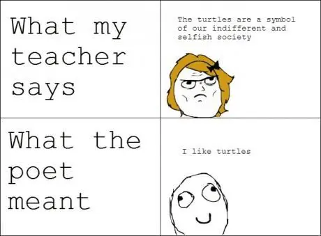 *El meme dice: lo que dice mi maestra/las tortugas son un símbolo de una sociedad egoísta e indiferente/lo que quiso decir el poeta/me gustan las tortugas