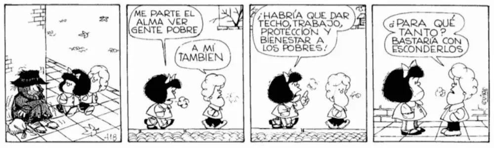 Hace algunas semanas vi la película Sorry We Missed You, de Ken Loach. Hace años había visto I, Daniel Blake, sobre un hombre que no puede trabajar por un accidente y correspondiente problema de salud y su periplo intentando cobrar el seguro de desempleo y lidiando con un sistema de bienestar (el inglés) que no te considera un ser humano. La película era un puñal directo al corazón. Dado que hace un tiempo que vivo en Londres pensé en hacer una retrospectiva de Ken Loach, pero después de ver Sorry We Missed You un domingo a la noche cambié rápidamente de idea. Honestamente, Loach te destruye y me hizo acordar a este chiste acidísimo de Quino.