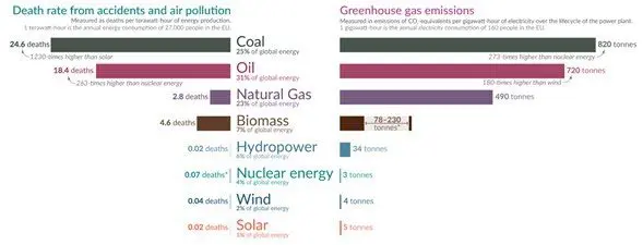 Como se puede ver, la estrategia de Greenpeace parece ser la de utilizar argumentos extremistas que apelan al miedo, relegando la evidencia empírica. Algo similar se observó cuando cuestionó la decisión del Gobierno de avanzar en los acuerdos necesarios para la construcción de una cuarta central nuclear, al afirmar que “es la fuente de energía más costosa y peligrosa que existe”. Como se puede ver en el gráfico a continuación, la energía nuclear es de las más seguras y limpias que hay. A la izquierda tienen la tasa de muertes por accidentes y polución, a la derecha la cantidad de gases de efecto invernadero que emite cada una.