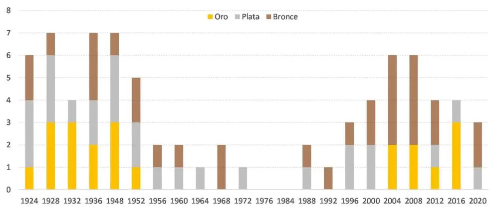 Si comparamos con los JJOO más recientes, el desempeño estuvo por debajo, principalmente porque por primera vez desde Sidney 2000 que no obtuvimos un oro, pero además porque fue el JJOO de menor cantidad de medallas, similar al de Atlanta 1996. Si tomamos una mirada de más largo plazo, el resultado de Tokio estuvo por debajo del promedio histórico de medallas totales (3,5), de oro (1) y de plata (1,2), pero por encima del de medallas de bronce (1,3).