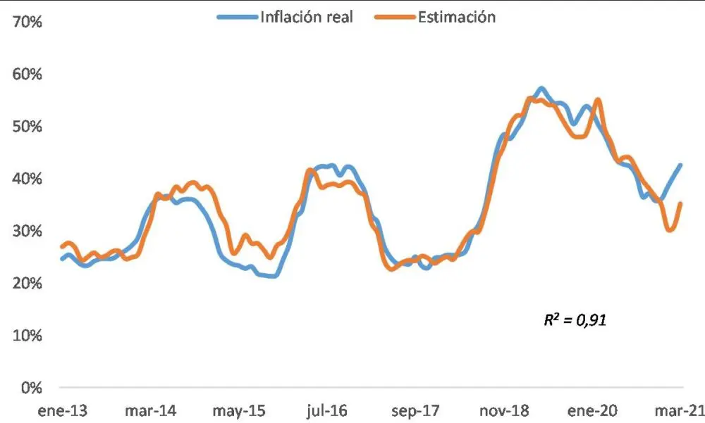 Hechas todas estas –necesarias- aclaraciones, pasemos a ver cómo se comporta nuestra estimación a través de los costos en relación al dato real de la inflación observada. Como se puede apreciar, el ajuste es muy preciso, mostrando una estrecha relación entre los datos reales y la estimación realizada. Fíjense que la mayor divergencia se observa, precisamente, en los últimos meses, lo que refleja que la aceleración inflacionaria estuvo explicada por algún otro motivo.