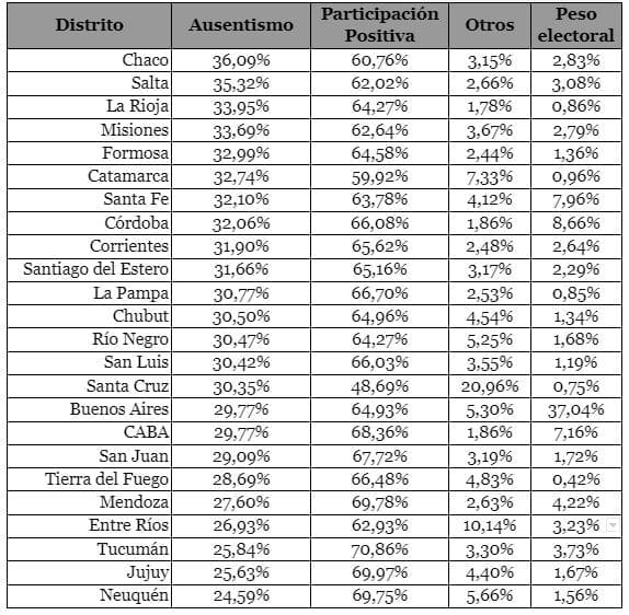 La siguiente tabla la armamos a partir de los datos compilados por Melisa Procopio y Rosario Aguiar Solá, ambas investigadoras asistentes del CICaD. Está ordenada desde un mayor a un menor ausentismo en las provincias. A ese dato le sumé la participación positiva (aquellos que fueron a votar y optaron por una de las opciones electorales en el cuarto oscuro), la categoría otros (que suma los votos en blanco, nulos, impugnados y recurridos) y el peso electoral (que muestra la porción del padrón nacional que representa cada distrito).