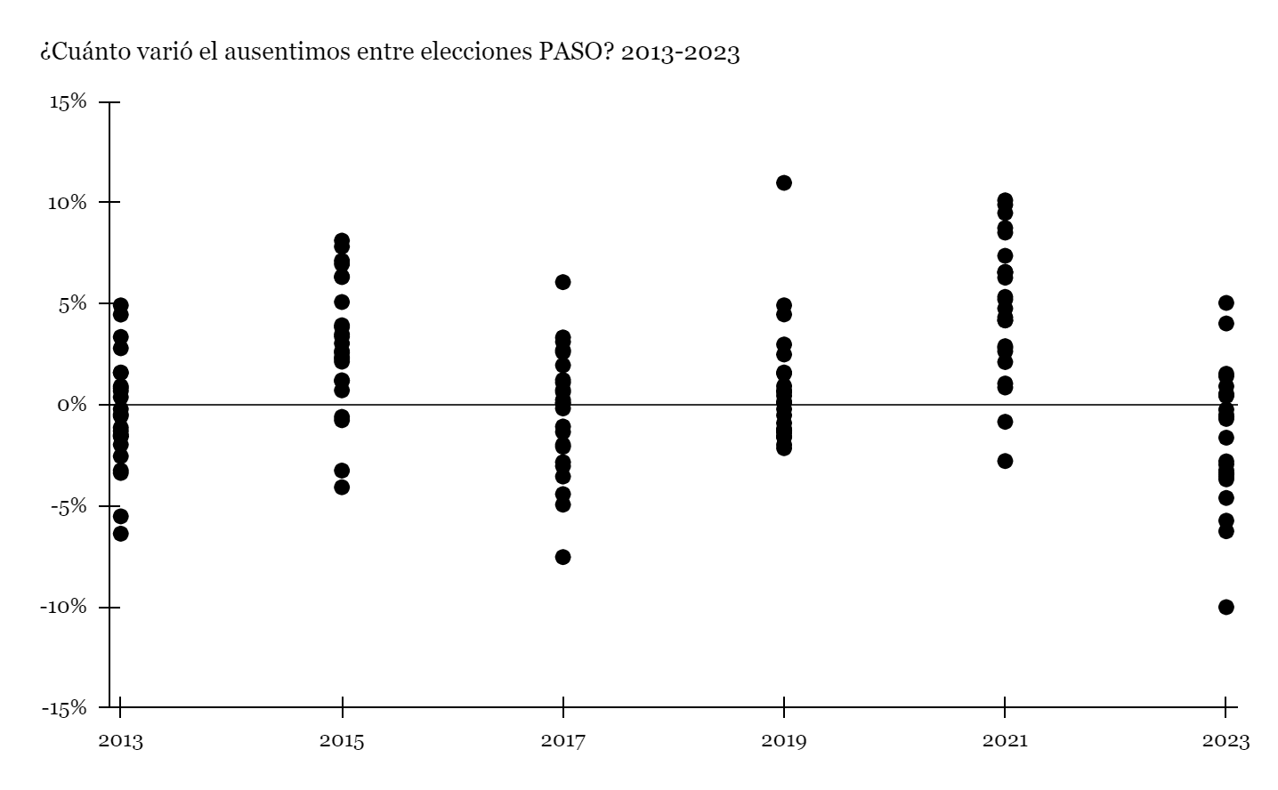 Vamos primero por las primeras PASO. Tal como ves, las de 2013 y 2017 partieron al país en dos. En esas elecciones de mitad de mandato, algunas provincias tuvieron un aumento del ausentismo respecto de las primarias presidenciales del año anterior, en tanto otras tuvieron una caída. Hay dos países con dos realidades en esas dos elecciones. Las de 2015, 2019 y 2021, en cambio, muestran más distritos por encima de la línea divisoria, lo que implica que menos gente fue a votar respecto de los comicios inmediatos anteriores. Lo loco de todo este berenjenal de puntos son las elecciones del domingo pasado. Si me entendiste lo que te vengo diciendo, podés ver clarito que la mayoría de las provincias tuvieron una caída del ausentismo en relación a las elecciones legislativas de 2021. Las de la pandemia, el desgaste y el cansancio. Igual que ahora, ¿no? Con la sorpresa que el pasado 13 de agosto fue más gente a votar en relación a dos años atrás. Y vos que pensabas que todo era oscuridad.