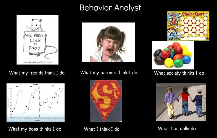 * El meme dice: Analista del comportamiento/Lo que mis amigos piensan que hago/lo que mis papás piensan que hago/lo que la sociedad piensa que hago/lo que mi jefe piensa que hago/lo que yo pienso que hago/lo que realmente hago