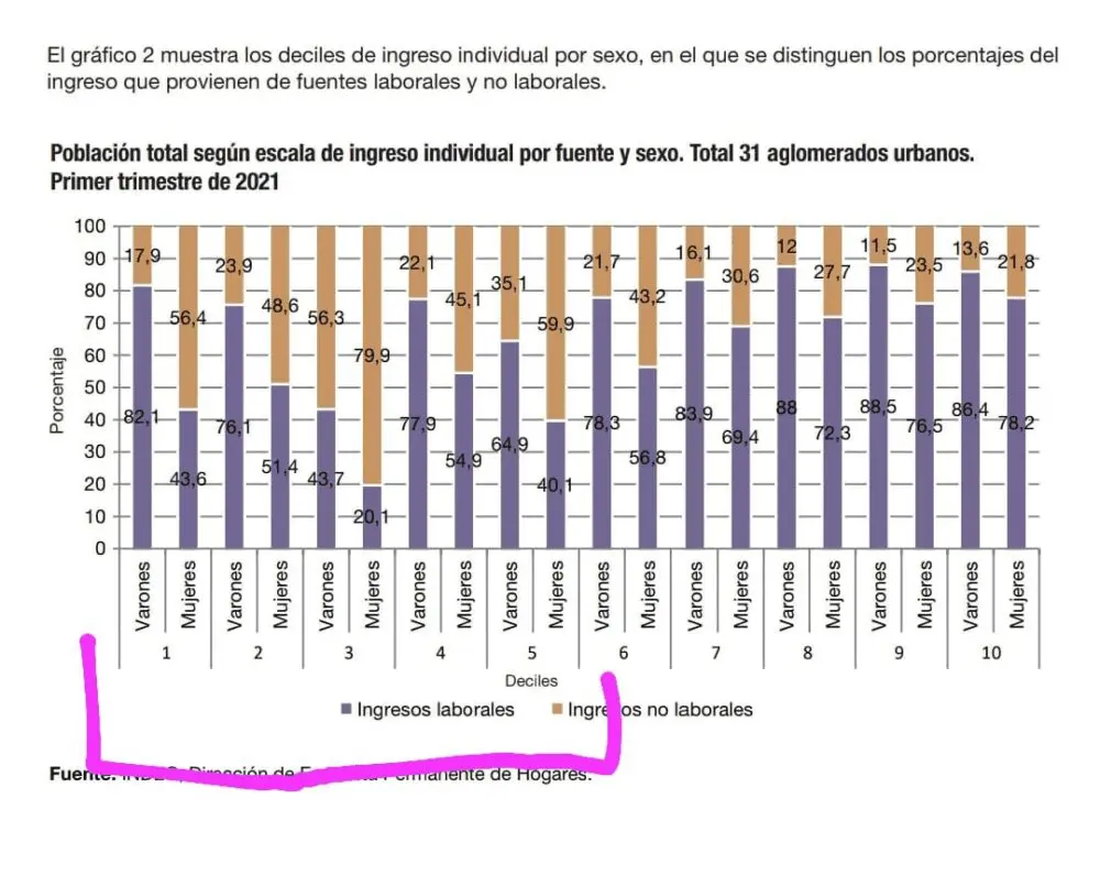 Un primer nivel es el error fáctico. Simplemente, es falso que las mujeres de los sectores más pobres están “en ventaja” con respecto a los varones de esas clases. Según datos del INDEC, es al revés: las brechas de ingreso entre lo que ganan, en promedio, las mujeres y los varones es más alta entre los y las trabajadores informales, justamente porque las mujeres dependen más de ingresos no laborales. La brecha de ingreso entre trabajadores y trabajadoras informales es más alta que la brecha de ingreso promedio entre varones y mujeres. La brecha de ingreso total individual al cuarto trimestre del 2020 da 24%, pero la de informales da 41%. Es decir, los varones empleados informalmente ganan más (en promedio) que las mujeres empleadas informalmente, aún cuando esas mujeres “manejan la tarjeta alimentaria”. Les trabajadores informales en Argentina tienen salarios mucho más bajos que los formales (y esto es una injusticia que afecta a varones y mujeres), pero las mujeres que deben emplearse en el sector informal tienen trabajos aun más precarios, por menos dinero, y en los cuáles trabajan menos horas “garantizadas” que los varones. (La mayoría de las trabajadoras informales está empleada como trabajadora de casas particulares). Esto puede verse en el gráfico 1.
