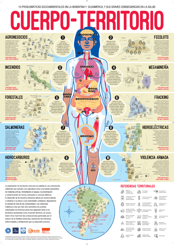 1- El grupo Iconoclasistas, junto al Instituto de Salud Socioambiental de la Facultad de Ciencias Médicas de la Universidad Nacional de Rosario, realizó un póster titulado “Cuerpo-Territorio” en el que se representan 10 problemáticas socioambientales en Argentina y Sudamérica y sus consecuencias para la salud.