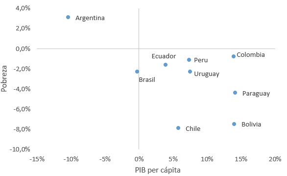 Variación del PIB per cápita (en dólares constantes) y de la pobreza (diferencia en puntos porcentuales) para 2013-2023
