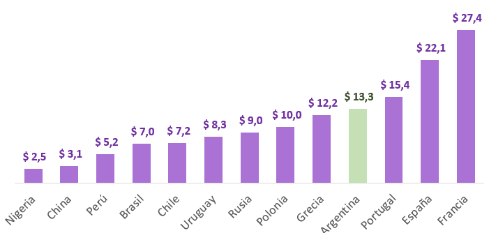 Esto tiene una explicación, y es el hecho de que la vara que utiliza el INDEC para medir la pobreza –es decir, la Canasta Básica Total– es bastante más elevada que en el resto de los países de la región. Como referencia, el gráfico de abajo muestra el valor monetario de la canasta de varios países, expresado en dólares, de modo que sean comparables. Como pueden ver, la vara de Argentina es relativamente alta (es la más elevada de la región y se ubica en niveles similares a los países europeos de ingresos medios).