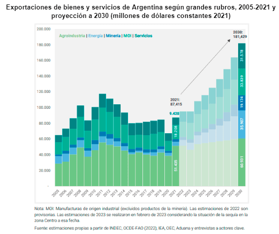 Estos discursos coinciden con un amplio consenso nacional respecto de la potencialidad argentina para brindar muchos productos que el mundo quiere y va a querer cada vez más en los próximos años, producto de la transición energética. Esta proyección la extraje del Plan Argentina Productiva 2030 y estima cuánto crecerán las exportaciones en diferentes rubros para el fin de esta década. Ya sabemos la importancia de las exportaciones para generar divisas genuinas y poder sostener el crecimiento económico con el aumento de importaciones asociado.