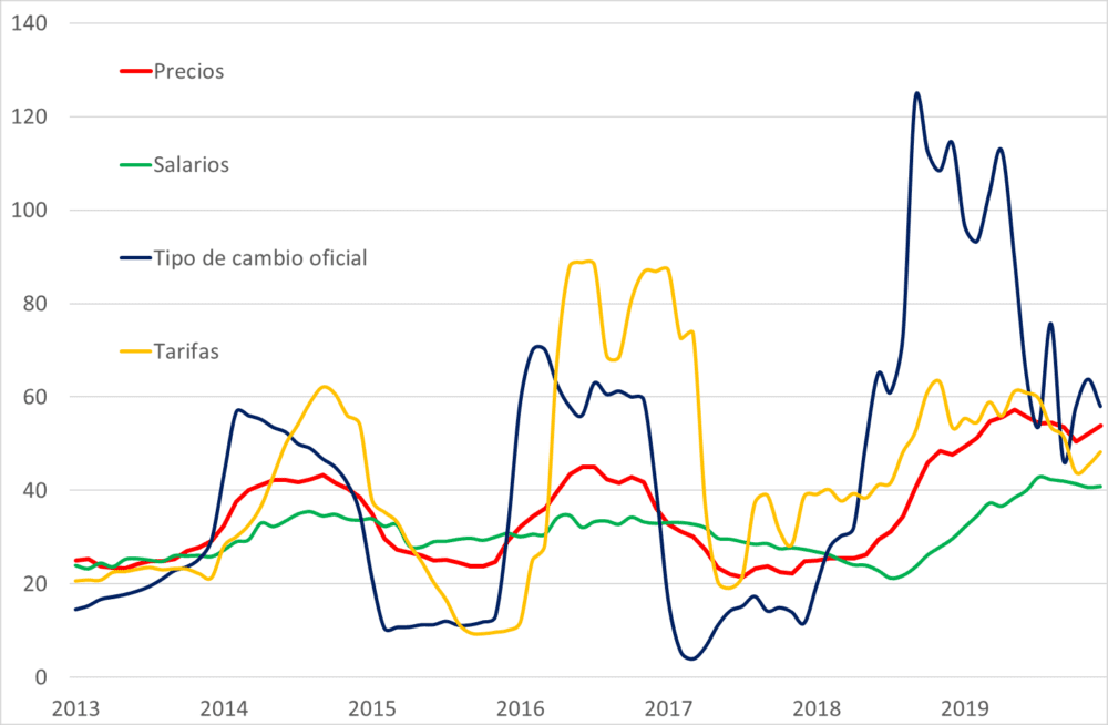 Variación anual de precios (inflación), salarios, tipo de cambio y tarifas