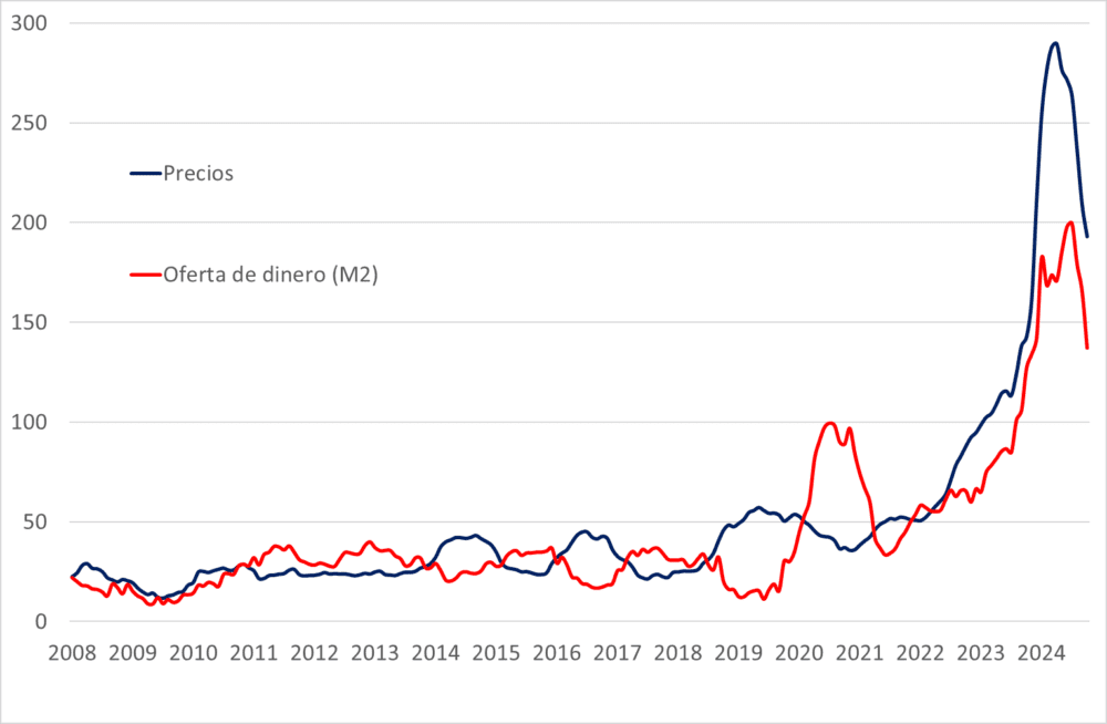 Variación anual de los precios (inflación) y de la cantidad de dinero