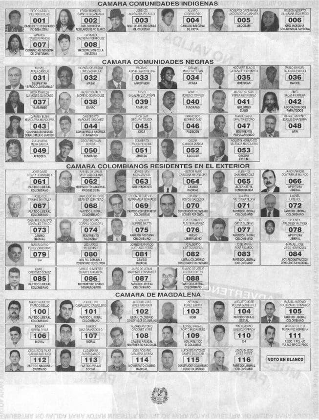 La Asamblea Constituyente, sin embargo, no entró en los detalles del diseño de la boleta, que nuevamente fue delegada a la Registraduría Nacional. La boleta adoptada se organizó por cargo; la Figura 2 muestra un ejemplo. Cada cargo en juego se presentó en una hoja de papel separada, lo que facilitó el corte de boleta y, en consecuencia, socavó el vínculo entre carreras. En lugar de los nombres de todos los candidatos de cada lista, el tarjetón sólo mostraba el nombre del primer candidato en la lista, junto con su foto y afiliación partidaria, pero sin incluir logos partidarios. La autoridad electoral, a partir de entonces, absorbió la responsabilidad de proveer las boletas en todos los centros de votación.