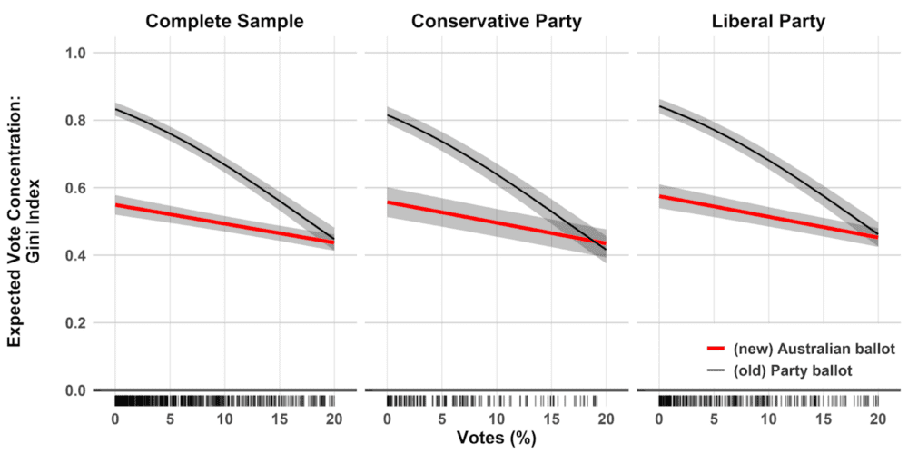 Las elecciones legislativas con boletas partidarias presentaron niveles más altos de concentración geográfica de votos, en comparación con las elecciones en las que se utilizó la boleta única. El Índice de Gini es un indicador standard de concentración, que va de 0 a 1, donde 0 indica una distribución perfectamente homogénea. Tal como se observa en el panel de la izquierda en la Figura 3, el índice de concentración cae de 0.792 a 0.532 en elecciones utilizando la boleta única, para una lista (facción) que obtiene el 3% de los votos; esta diferencia es estadísticamente significativa. Además, al examinar las listas de los partidos principales en los dos paneles restantes, los cambios en la concentración esperada no difieren considerablemente entre las facciones conservadoras, liberales o de otros partidos.