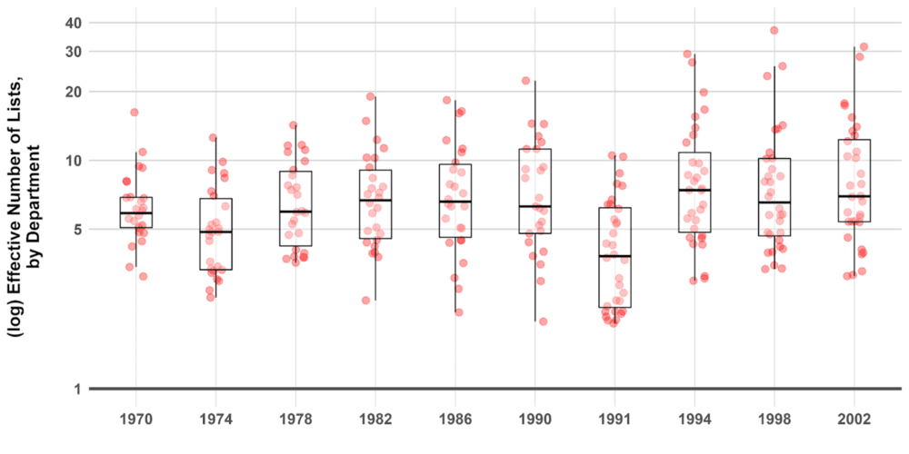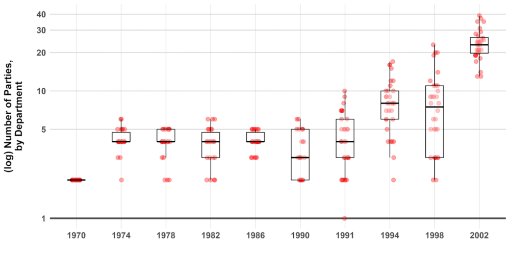 El Frente Nacional fue un período en el que el Partido Liberal y el Partido Conservador acordaron rotar en el poder, lo que permitió mantener un número reducido de partidos. Tras el fin del acuerdo en 1974, tal como se puede observar en el panel superior de la Figura 4, el número de partidos aumentó rápidamente, de dos partidos efectivos en cada departamento en 1970, a una mediana de cuatro durante los 70s y 80s, para saltar a una mediana de aproximadamente ocho partidos en 1994, y alcanzar en 2002 una mediana de 23 partidos efectivos por departamento. Al final del período, el número de partidos que presentaron candidatos en las elecciones legislativas era notablemente alto.