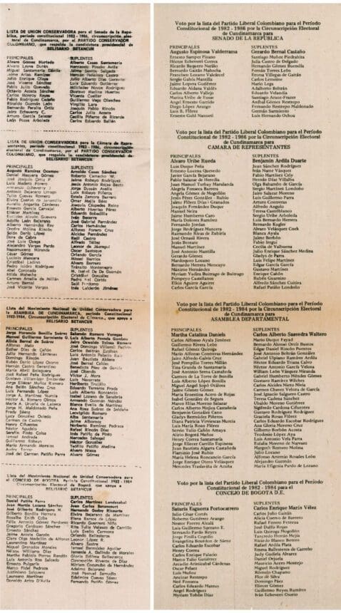 SumateLas reglas electorales permitían que los partidos presentaran más de una lista de candidatos, por lo cual liberales y conservadores usualmente competían con varias listas de representantes bajo un solo ticket senatorial. Los líderes partidarios aseguraban, de ese modo, que las facciones locales encontraran un lugar en la boleta y ellas se beneficiaban de hacer campaña juntas. Algunas listas disidentes también podían presentar candidatos, aunque ellas no contaban con el apoyo de la organización del partido.