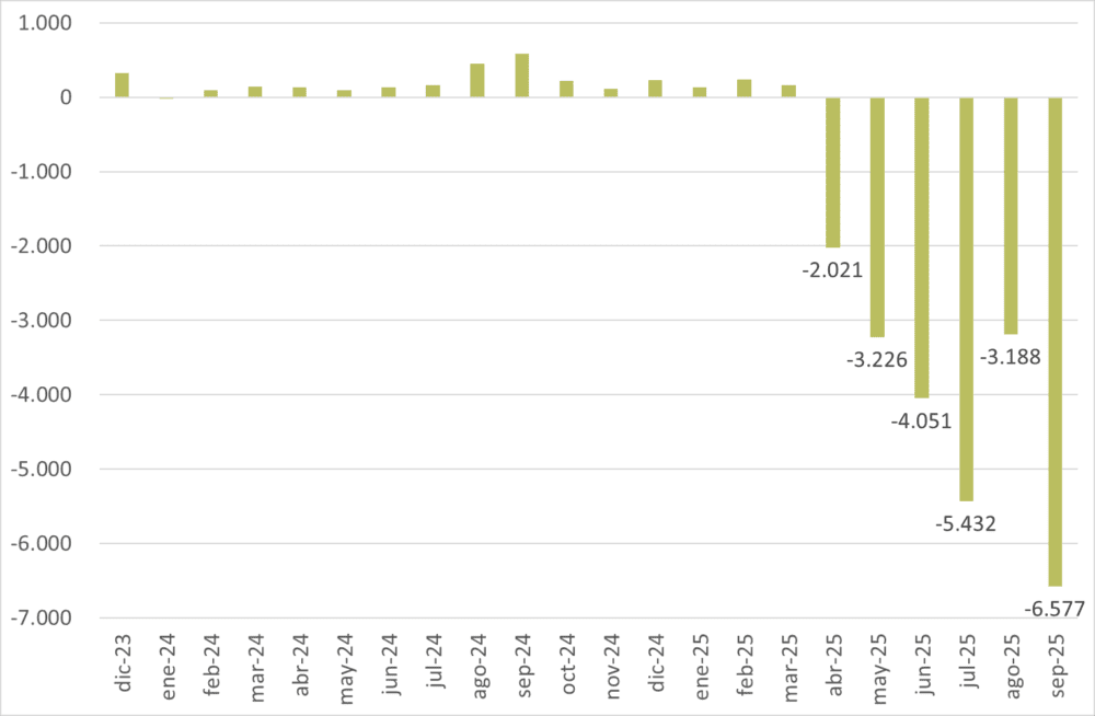 Sin embargo, al mirar la cuenta corriente argentina del último tiempo, notamos que no sobran muchos dólares por ahí. Entre junio de 2024 y mayo de 2025 fue deficitaria. Y desde entonces es superavitaria, pero únicamente gracias a la reducción temporal de retenciones primero, y ese breve período en el que se eliminaron y se adelantó liquidación por 7 mil millones de dólares (con la polémica acerca de si esta baja le llegó al productor).