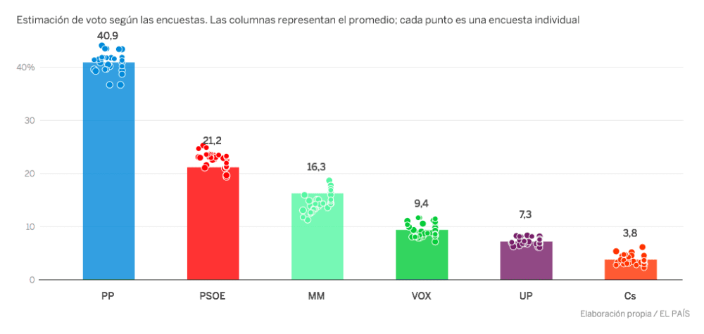 ¿Qué dicen las últimas encuestas? Hasta mediados de la semana pasada, el PP encabezaba los sondeos con un cómodo 41% de intención de voto, seguido por el PSOE con poco más de la mitad (21%); Más Madrid de Iñigo Errejón con el 16% y la extrema derecha de Vox con poco menos del 10%. Unidos Podemos de Pablo Iglesias quedó en un flaco quinto lugar con el 7% y los liberales de Ciudadanos hacen todo por superar el umbral electoral del 5% de los votos para no quedar afuera.