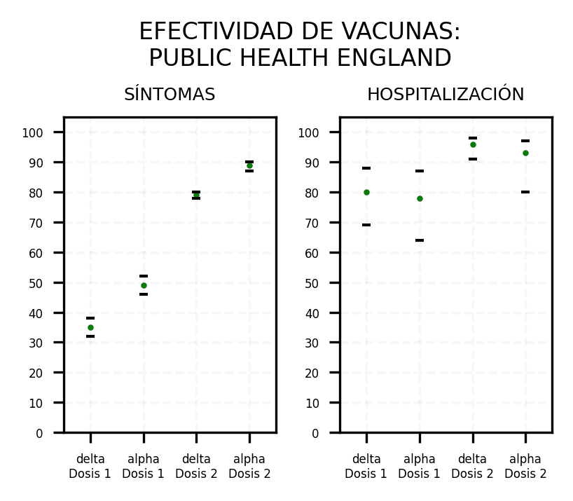 Por eso, más importante que la efectividad contra enfermedad sintomática es lo que se observa en el gráfico de acá abajo, que muestra datos del Public Health England. A la izquierda se visualiza la efectividad contra enfermedad sintomática. A la derecha está representada la efectividad contra hospitalización. Como se ve, esta última ya es muy alta con una sola dosis (alrededor del 80%) y es un poco más alta con dos (arriba del 90%).