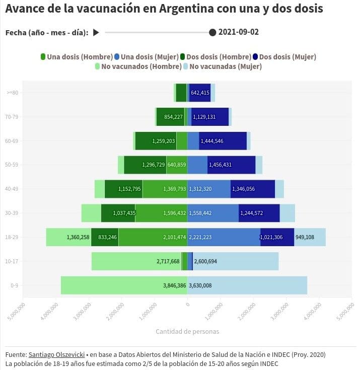 Todos los gráficos cuya fuente no se explicita fueron elaborados por Santiago Olszevicki en base a la información del sitio Ourworldindata.com, que recopila los datos oficiales de casi todos los países del mundo. Aquellos que reflejan información de Argentina se nutren del registro desagregado de vacunación del Ministerio de Salud de la Nación y la proyección de población de INDEC para el año 2020. Toda la información fue actualizada al día 02/09/2021.