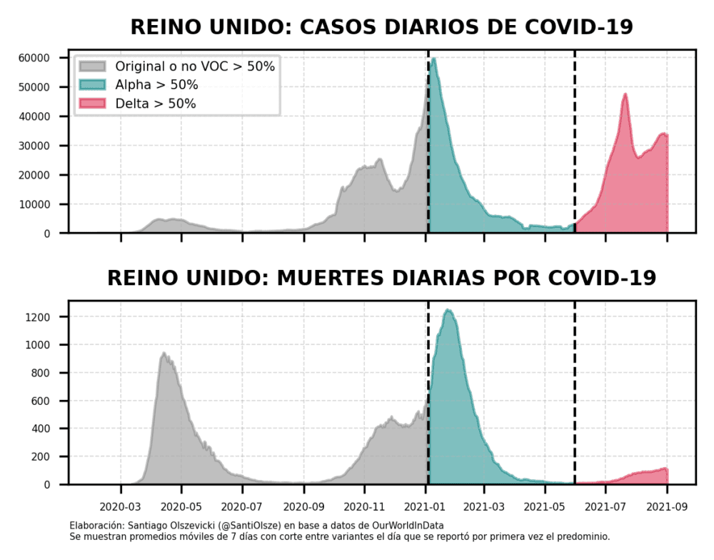 Tomemos, de nuevo, el ejemplo de Reino Unido, donde Delta es mayoritaria desde finales de mayo. Se trata de un caso que resulta particularmente interesante para la comparación porque Argentina espejó su táctica de vacunación, demorando la segunda dosis y aplicando primeras dosis a la mayor cantidad de gente posible (lo que ya va dando muestra de ser una táctica mejor que la de dar la segunda dosis a los 20 días -al menos en vacunas adenovirales y de ARN-).