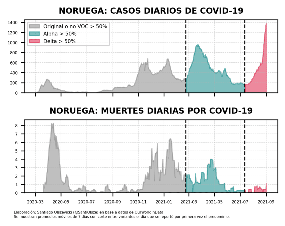 Como era esperable, Reino Unido tuvo muchísimos casos (además, porque testea muchísimo) pero prácticamente aplastó la curva de muertes y hospitalizaciones. Y no es un bicho raro en el concierto de los países con alta tasa de vacunación: es lo que se observa en todos los países europeos o incluso en estados con alta tasa de vacunación en EEUU. Muchos casos confirmados (incluso en algunos países, como Noruega, por encima de las olas anteriores), pocos muertos.