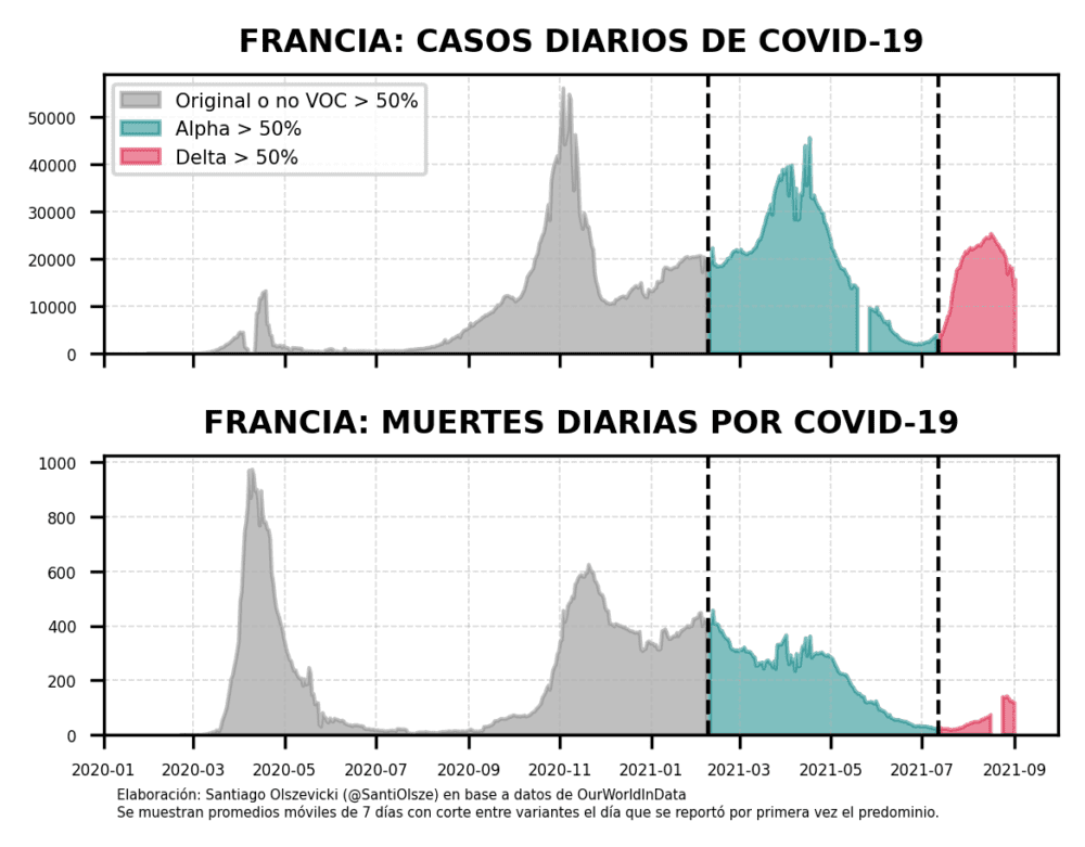 Otra cosa que se ve es que tanto en los lugares más vacunados como en los menos, el grueso de las hospitalizaciones y las muertes son entre no vacunados. Digámoslo claro: si todos los que tuvieron acceso a vacunarse en Reino Unido o Francia se hubiesen vacunado, la curva roja de muertes de abajo se vería aún más plana de lo que se ve.