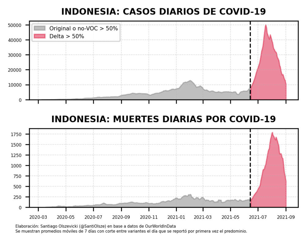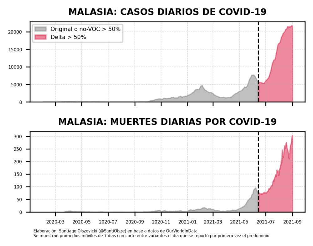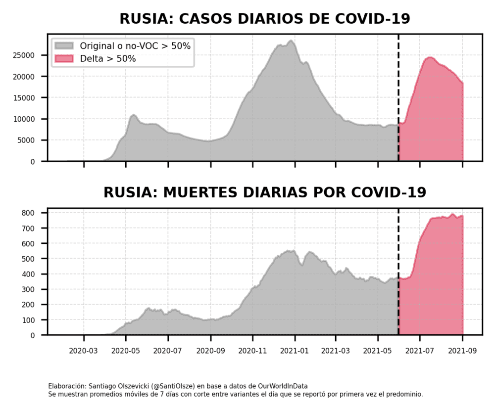 Entonces, ¿dónde es devastadora la Delta? A esta altura, no hay demasiadas dudas: donde había pocos vacunados cuando entró. A diferencia de los países que mostramos más arriba, en los cuales la curva de casos y la de muertes se desacoplan, en los países con pocos vacunados van de la mano. Y estas son solamente las muertes confirmadas como muertes COVID: si se toma en consideración el exceso de muertes, el panorama es mucho más dramático. Solamente en el mes de julio, Rusia tuvo un exceso de 64 mil muertes, aunque las muertes confirmadas fueron algo más de 21 mil.