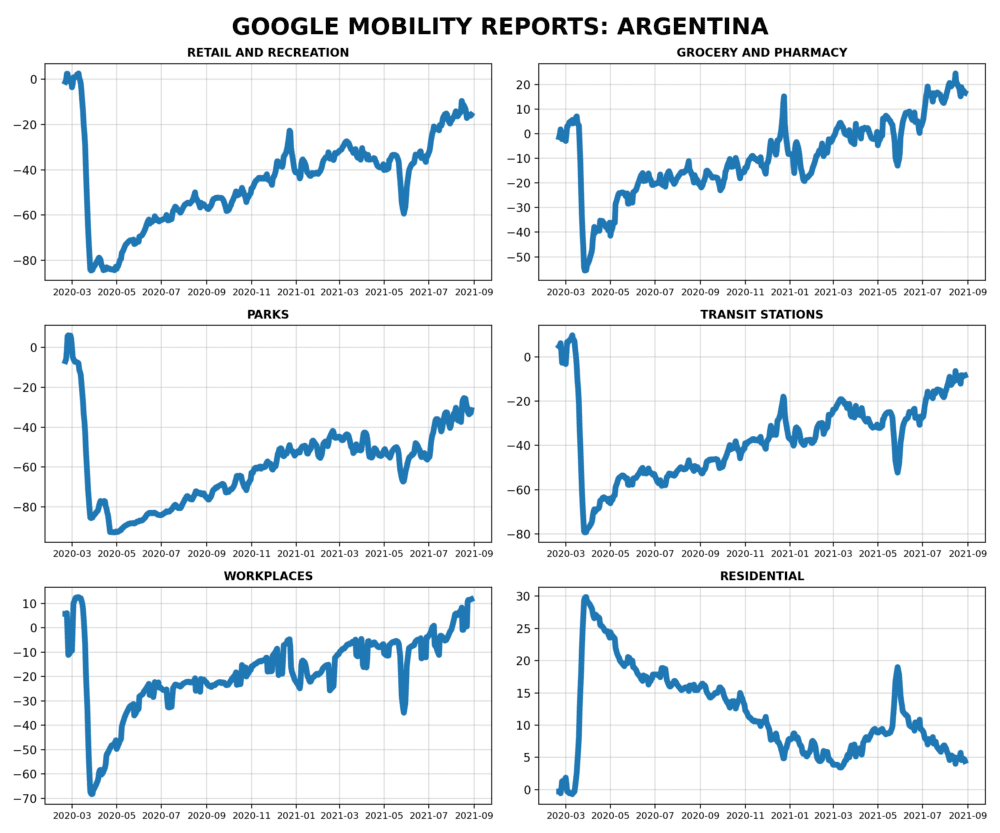 Porque ese es otro punto importante para dimensionar toda la situación: las olas de Delta se dan en todos los países con mucha más movilidad (y, es de suponer, muchas menos restricciones y cuidados), que todas las anteriores. La movilidad en Reino Unido, por ejemplo, es la máxima desde que empezó la pandemia. Incluso en Argentina, donde aún Delta no domina, la baja de casos es contemporánea con una movilidad que ya está a niveles pre-pandémicos.